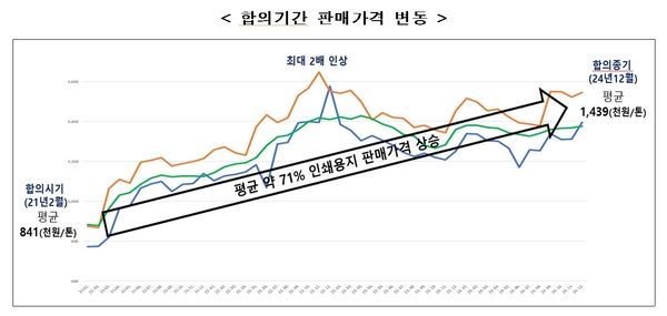 ▲ 6개 인쇄용지 제조·판매업체가 2021년 2월부터 2024년 12월까지 가격을 담합한 결과 약 71%가 인상됐다. 공정거래위원회 제공