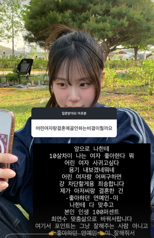 이날 한 팬은 “어린 여자와 결혼에 골인하는 비결이 뭘까요”라고 질문했고, 이에 최연수는 “앞으로 나한테 ‘열 살 차이 나는 여자 좋아한다, 어린 여자 사귀고 싶다, 용기 내보겠네, 어린 여자와 어쩌고’ 하면 그냥 차단할게요. 죄송합니다”라고 답했다.