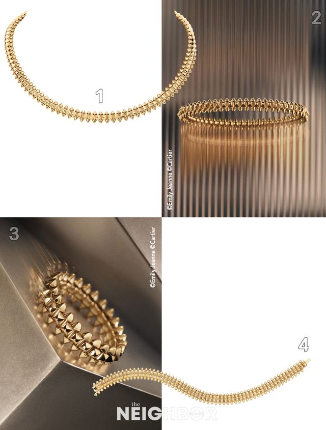 1 옐로 골드 소재의 클래쉬 드 까르띠에 네크리스 플렉시블 미디엄 모델. 2 클래쉬 드 까르띠에 브레이슬릿. 3 클래쉬 드 까르띠에 링. 4 옐로 골드 소재의 클래쉬 드 까르띠에 브레이슬릿 플렉시블 더블로우 모델.