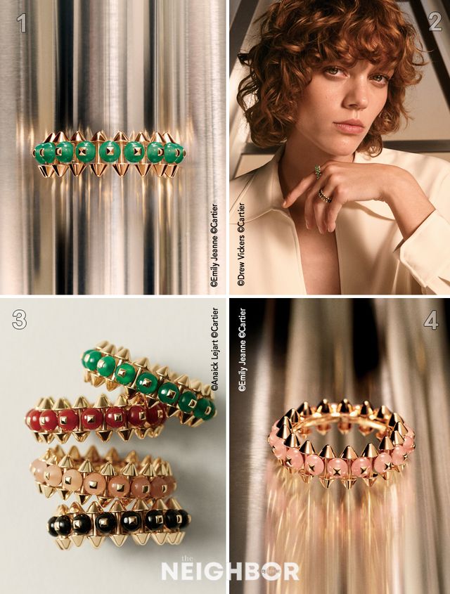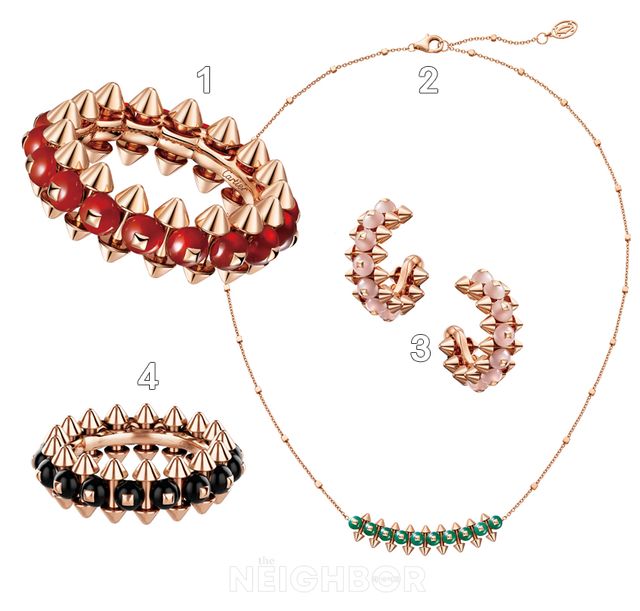1 레드 아게이트를 세팅한 핑크 골드 소재의 클래쉬 드 까르띠에 링. 2 그린 아게이트를 세팅한 핑크 골드 소재의 클래쉬 드 까르띠에 네크리스. 3 핑크 칼세도니를 세팅한 핑크 골드 소재의 클래쉬 드 까르띠에 이어링. 4 오닉스를 장식한 클래쉬 드 까르띠에 이어링.