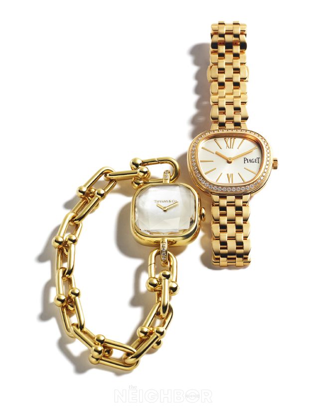 시계의 ‘얼굴’인 다이얼만큼 제품 전체의 인상에 영향을 주는 또 다른 요소가 바로 스트랩이다. 옷차림이 가벼워진 계절, 주얼리를 대신할 골드 브레이슬릿 워치로 손목 위에 반짝임을 더해보자. 티파니 하드웨어 옐로 골드 워치는 1962년 아카이브에서 발견한 브레이슬릿을 재해석한 아이코닉한 게이지 링크를 재해석해 유려하게 흐르는 유선형 디자인이 특징이다. 60년대의 화려함을 바탕으로 피아제가 표방하는 ‘형태의 유희’를 기념한 독창적인 트라페즈 다이얼의 식스티 워치도 눈길을 끈다. 조각과 같은 가드룬을 장식한 케이스에 매치한 5열의 18K 로즈 골드 브레이슬릿은 가운데 3열을 직면, 양끝의 2열을 곡면 처리해 볼드한 입체감을 자랑한다.