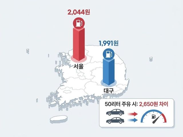 가장 비싼 지역은 서울(2,044원), 가장 저렴한 지역은 대구(1,991원)로 두 지역 간 격차는 리터당 53원에 달했다. 50리터를 가득 채운다고 가정하면 서울과 대구의 주유 비용 차이는 2,650원으로 벌어진다. 단순 계산이지만 월 2~3회 이상 주유하는 운전자라면 거주 지역에 따라 한 달 유류비에서 5,000~8,000원 안팎의 차이가 생길 수 있다.