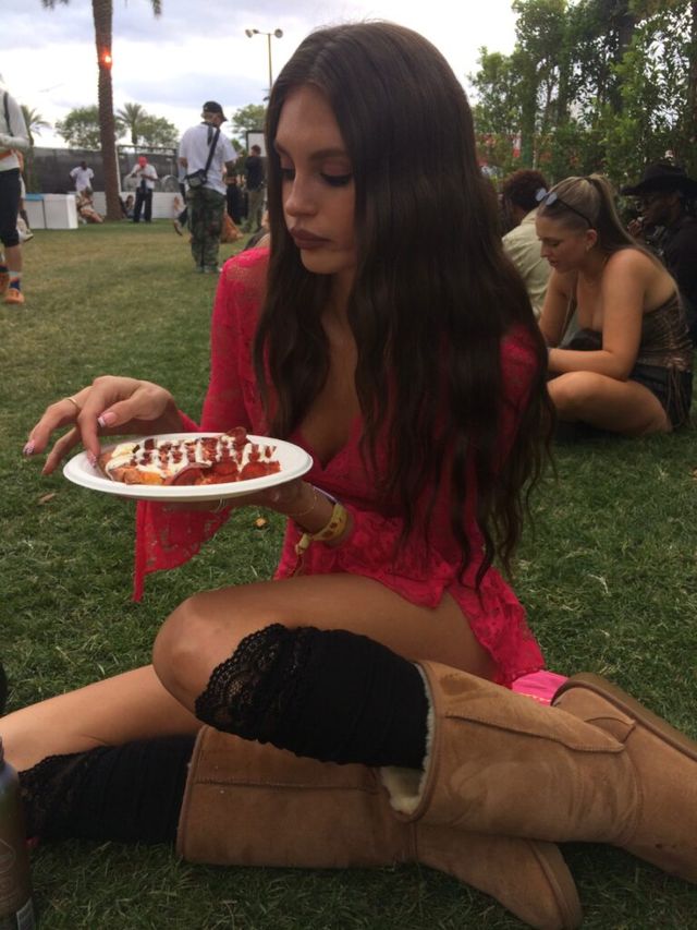 사랑스럽고 페미닌한 스타일에 투박한 슈즈 매치도 매력 있죠. LA에서 활동하고 있는 모델 제일리 힌지는 이번 코첼라 페스티벌에서 레이스 시스루 드레스와 대비되는 묵직한 어그 부츠를 선택했습니다. 가벼운 레이스와 무거운 양털 부츠라는 도저히 공존할 수 없을 것 같은 두 아이템의 만남은 오히려 특별한 페스티벌 룩이 되었죠.