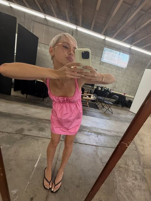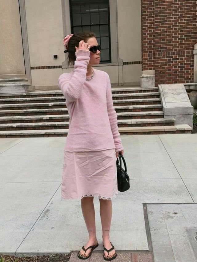 화려하고 드레시한 룩이 가끔 너무 느끼하다고 느껴진다면? 플립플롭으로 온도를 낮춰보세요. 아이리스 로는 선명한 핑크 컬러의 슬리브리스 드레스에 투박한 블랙 플립플롭을 매치했습니다. 목과 손목을 장식한 골드 톤의 네크리스와 브레이슬릿이 자칫 해변의 룩으로 전락할 뻔한 스타일링의 중심을 잡아줍니다.