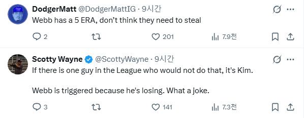 한 팬은 "김혜성은 절대 그런 행동을 할 선수가 아니다. 웹은 지고 있어서 예민해진 것뿐이다. 우스운 일이다"라고 일침을 날렸고, 다른 팬들 역시 "웹의 평균자책점이 5점대인데, 굳이 사인을 훔칠 필요가 있겠나", "이건 예전부터 존재하던 일이고 합법이다. 왜 투수들이 갑자기 이렇게 예민하게 반응하는지 모르겠다"는 등 웹의 반응을 비판하는 의견을 쏟아냈다.