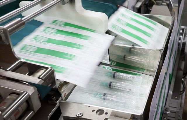 15일 경기도 안산시 단원구 한국백신 공장에서 완성된 주사기 포장작업이 진행되고 있다. /뉴스1 (공동취재)
