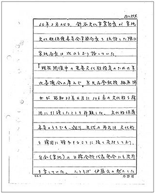문화재보호위원회는 1950년 8월에 문화재를 보호·관리하기 위해 문부성의 외국(外局)으로 설치되었다. 상기 문서가 작성되었을 당시 다카하시 세이치로가 문부대신(1947년)을, 이치마다 히사토가 일본 은행 총재(1946년)을 역임하는 등 문화재보호위원회의 전문위원은 정계·재계·학계의 유력 인물이었다.