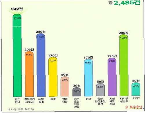 복수 응답이 허용된 피해 유형 조사에서는 조건만남이 942건(37.9%)으로 최다였다. 이어 폭행 및 금품 갈취 289건(11.6%), 디지털 성범죄 280건(11.3%), 심리적 길들이기 206건(8.3%) 순으로 나타났다.