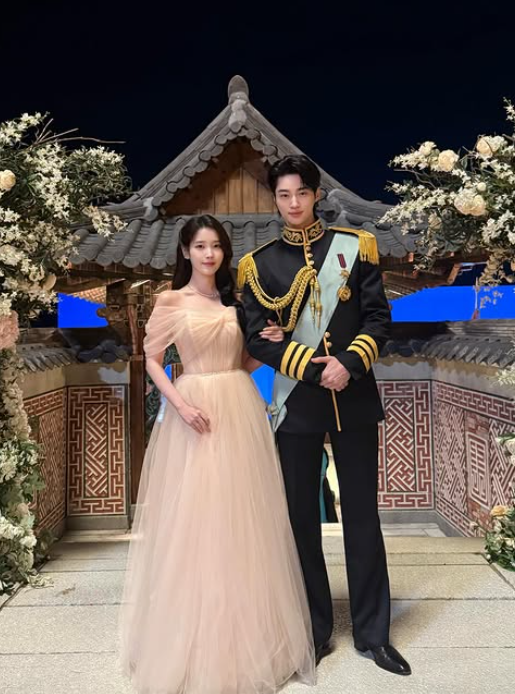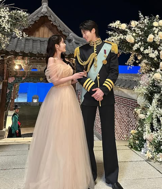 또 다른 사진에서 변우석과 아이유는 극중 왕실 내진연 무도회 장면 촬영장을 배경으로 나란히 서서 카메라를 향헤 포즈를 취하고 있다. 서로를 다정하게 바라보며 미소 짓는 사진에서는 두 사람의 훈훈한 케미스트리가 고스란히 담겨 눈길을 끌었다.
