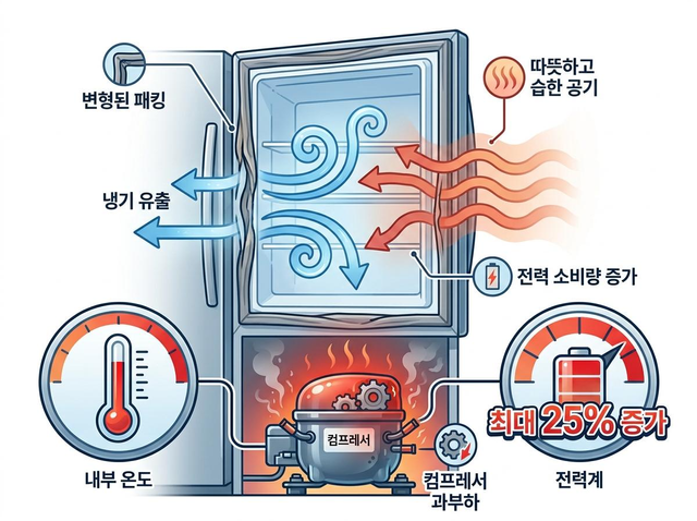 패킹이 변형되면 문을 아무리 세게 닫아도 본체와 완전히 밀착되지 않는다. 그 미세한 틈으로 바깥의 따뜻하고 습한 공기가 냉장고 안으로 계속 밀려 들어온다. 내부 온도가 올라가면 냉장고는 설정 온도를 맞추기 위해 컴프레서를 더 자주 더 오래 돌린다.