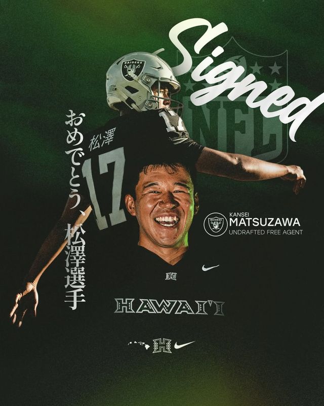 일본 매체 '스포니치 아넥스'는 26일(한국시간) "미국 하와이대 소속 키커 마쓰자와 간세이가 레이더스와 드래프트 외 신인으로 계약했다"고 보도했다.