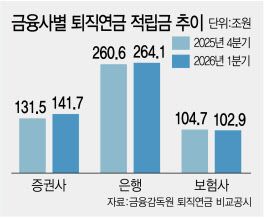 신규 적립금 흐름을 보면, 전체 유입 규모 가운데 상당 부분이 증권사로 몰린 것으로 나타났다. 증권사들의 1분기 총 적립금은 141조 6797억원으로 직전 분기(131조 5026억원) 보다 10조 1000억원이 늘어났다. 같은 기간 은행은 260조 5580억원에서 264조 1205억원으로 4조원 정도 올랐으며 보험사는 104조 7415억원에서 102조 9339억원으로 줄어들었다. 신규 증가분의 대부분을 증권사가 가져간 셈이다.