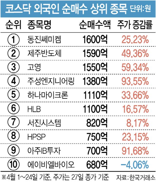 27일 한국거래소에 따르면 외국인 투자자는 코스닥 시장에서 이달 들어 지난 24일까지 동진쎄미켐(005290)을 약 1600억원어치 순매수했다. 이어 제주반도체(080220)(1590억원), 고영(098460)(1550억원), 주성엔지니어링(036930)(1380억원), 하나마이크론(067310)(1110억원) 등이 순매수 상위권에 이름을 올렸다. 이 밖에도 서진시스템(178320)(820억원), HPSP(403870)(750억원) 등 주요 종목이 상위권에 포함되며 반도체 관련주 쏠림 현상이 뚜렷하게 나타났다.