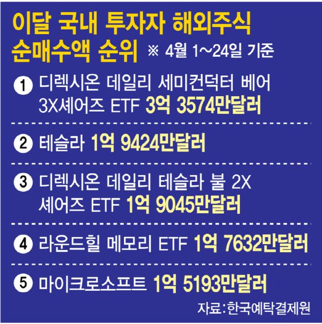 27일 한국예탁결제원에 따르면 이달 들어 지난 24일까지 국내 투자자의 해외주식 순매수 1위 종목은 ‘디렉시온 데일리 세미컨덕터 베어 3배 ETF’(SOXS)였다. 순매수 금액은 3억 3574만달러(4940억원)로 집계됐다. SOXS는 미국 반도체 업종 주가가 하락할 때 수익이 나는 인버스 레버리지 상품으로, ICE 반도체 지수의 하루 수익률을 반대 방향으로 3배 추종한다.