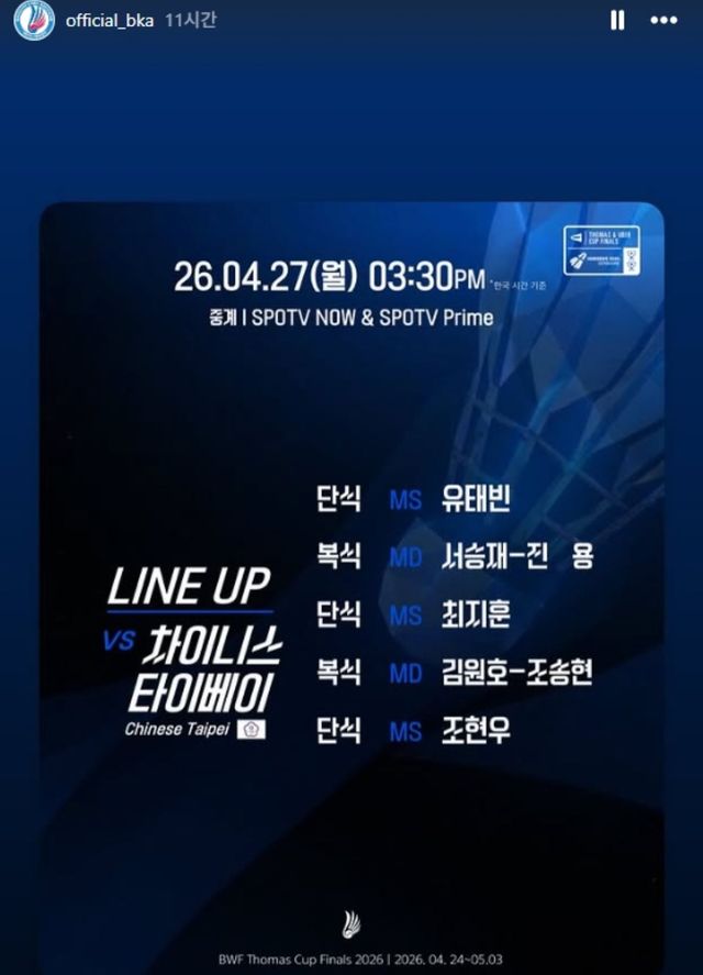 이날 한국은 남자복식 세계랭킹 1위 서승재-김원호(이상 삼성생명) 조가 나누어져 서승재-진용(요넥스) 조, 김원호-조송현(광주은행) 조로 구성돼 복식 경기를 펼쳤다.