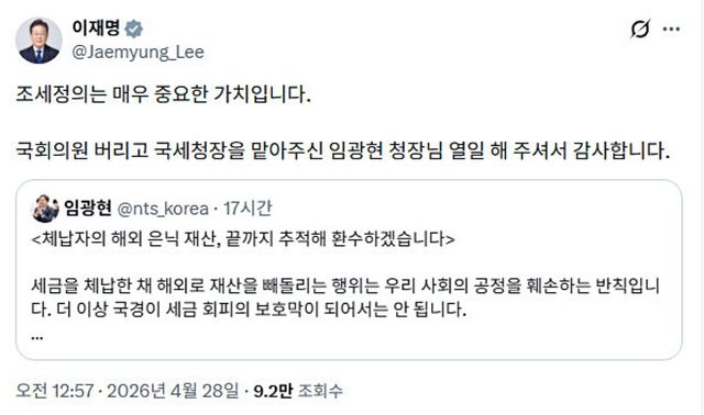 이 대통령이 공유한 임 청장 원문 게시물은 해외 체납 재산 환수 성과가 담겨있다. 임 청장은 "세금을 체납한 채 해외로 재산을 빼돌리는 행위는 우리 사회의 공정성을 훼손하는 반칙"이라며 "더 이상 국경이 세금 회피의 보호막이 돼서는 안 된다"고 밝혔다. 또 "100여 개가 넘는 국가와 금융·부동산 정보를 주고받으며 체납자의 해외 은닉 재산을 추적하고 있다"고 설명했다.