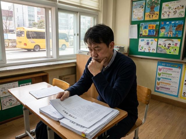 교사가 책상에 앉아 수학여행 계획 서류를 보며 깊은 고민에 빠져있는 모습. 교사가 책상에 앉아 수학여행 계획 서류를 보며 깊은 고민에 빠져있다.