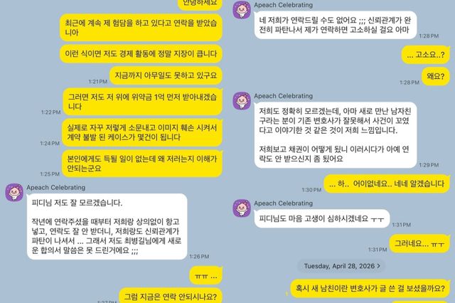 법무대리인이 바뀌신 거라면 저에게 ’남자답게‘ 직접 연락주세요. 변호사의 연락을 막은 적 없습니다. 다만 실제 통신이 막혀 통화와 문자는 수신이 불가하고 오직 카톡만 되는 점 양해 부탁드립니다.
