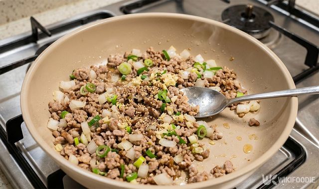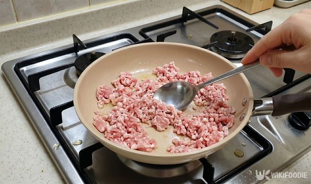 팬에 기름을 두르고 다진 돼지고기를 먼저 볶는다. 이때 강한 불을 유지해야 고기의 수분이 날아가면서 누린내가 남지 않는다. 고기가 어느 정도 익으면 양파와 대파, 마늘, 생강을 넣는다.