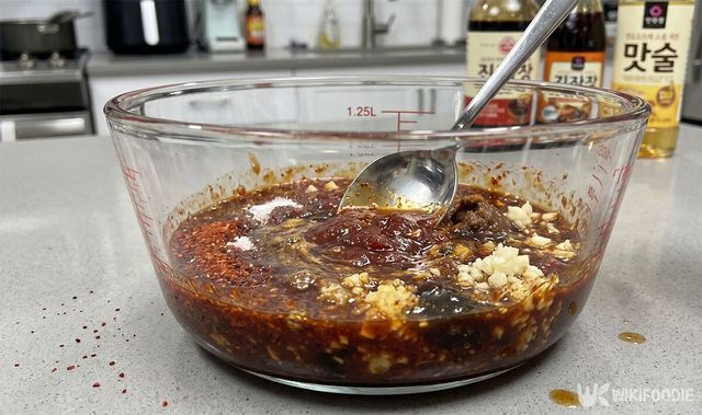 진간장 2큰술, 고추장 2큰술, 된장 1큰술, 고춧가루 2큰술, 다진 마늘 2큰술, 다진 생강 1/2큰술, 맛술 3큰술, 설탕 1큰술, 굴 소스 1큰술, 참기름 1큰술