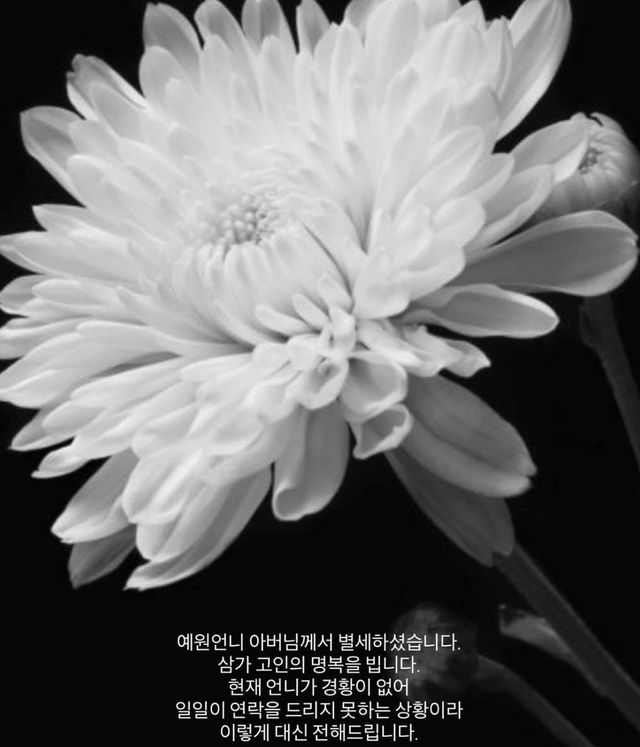 30일 강예원의 개인 계정에는 “아버님께서 별세하셨습니다”라는 글과 함께 부고 소식이 전해졌다. 게시글에는 현재 강예원이 경황이 없어 직접 연락을 드리지 못하는 상황이라 대신 전한다는 내용이 담겨 있어, 해당 소식은 관계자가 대신 알린 것으로 보인다.