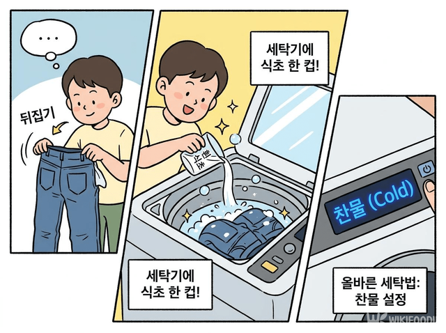 세탁 전 준비도 중요한데, 청바지를 세탁기에 넣기 전에 안팎을 뒤집어서 겉면이 안쪽을 향하게 만드는 것이 좋다. 세탁 중 세탁기 벽면이나 다른 옷과 마찰이 생길 때 겉면이 직접 닿지 않도록 막아주는 방법이다. 찬물로 수온을 설정하고, 식초를 먼저 넣은 뒤 어두운 색 전용 세제를 적정량 추가해 세탁하면 된다.
