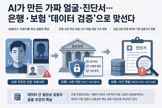 AI를 활용한 위·변조 시도가 금융권 전반으로 확산되면서, 은행권과 보험업계는 단일 인증을 넘어 데이터 기반 검증 체계를 강화하고 있다. 비대면 계좌 개설 과정에서 딥페이크 얼굴 영상을 활용한 인증 시도가 발견되고, 의료기록을 정교하게 변조해 보험금을 청구하는 사례도 확인되고 있어서다. 개별 인증만으로 식별이 어려운 수준까지 위조 수법이 정교해지면서, 데이터 간 일관성을 비교하는 방식이 핵심 대응 수단으로 떠오르고 있다.